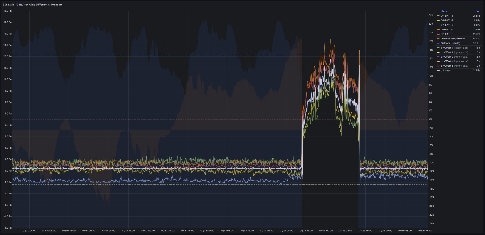 One of the most demanding tasks was the control of the data hall cooling system. The PID H∞ Designer tool: www.pidlab.com. The high quality of differential pressure control in individual server room aisles is evident from the image in the gallery, which shows one week of operation. During this period, a communication failure with the control system occurred for approximately one day, during which the air conditioning units operated autonomously. During the outage, the control performance deteriorated significantly, leading to roughly double the energy consumption.